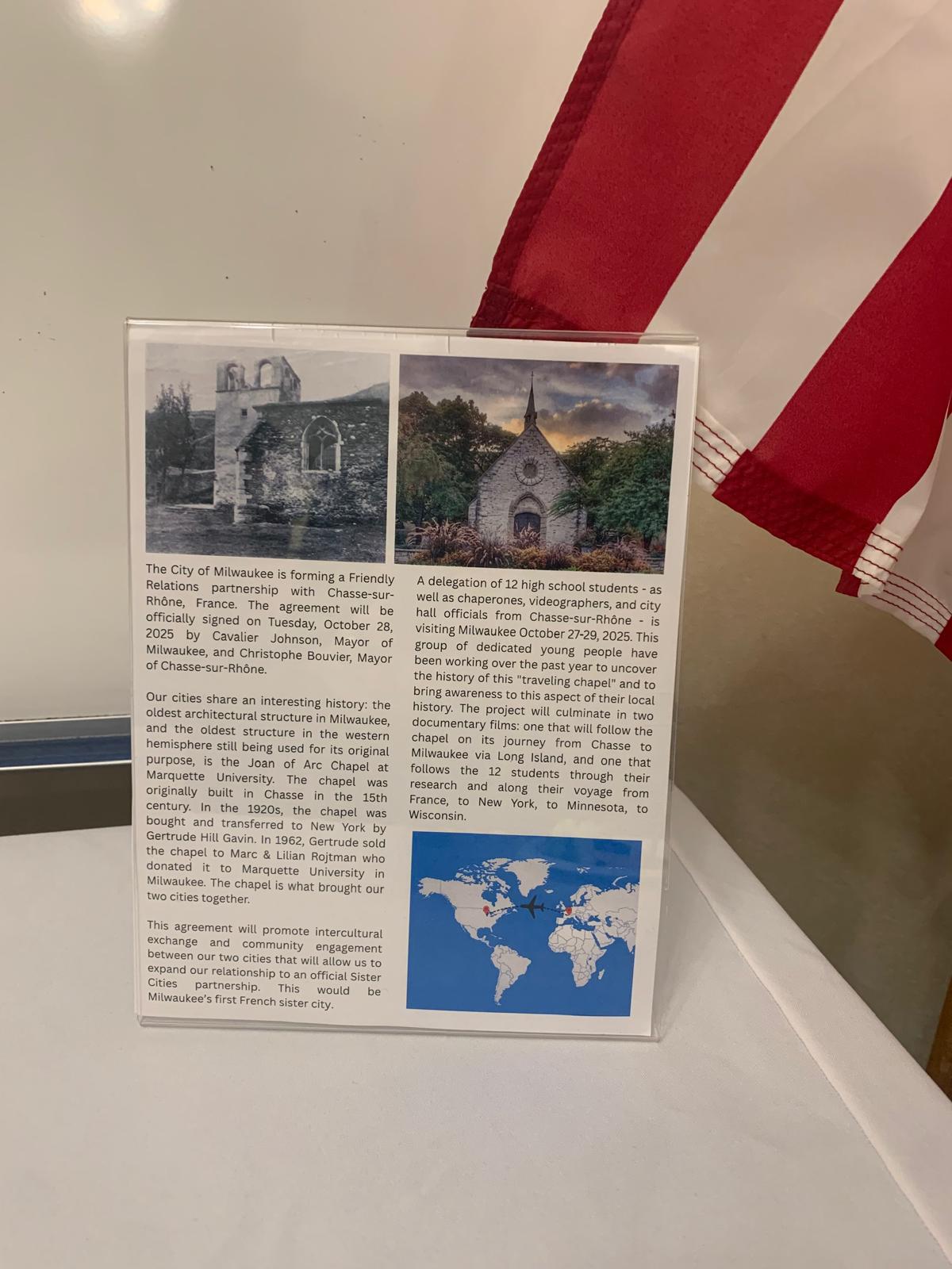 Nos jeunes seront les ambassadeurs de notre ville à Milwaukee, ils apporteront avec eux le patrimoine actuellement présent chez nous, nos vestiges, notre mode de vie, nos valeurs mais aussi notre musée numérique : la Micro-Folie. Ils reviendront à la maison avec une partie immatérielle de notre patrimoine envolé, ils pourront expliquer ce qu’est devenue la Chapelle et la notoriété qu’elle a acquise là-bas. Pour restituer ce voyage, ils s’attèleront à la réalisation d’un documentaire qui paraitra au printemps 2026. Documentaire qui rentrera dans le patrimoine culturel de Chasse-sur-Rhône, comme une trace de notre passage à tous et toutes dans cette commune.